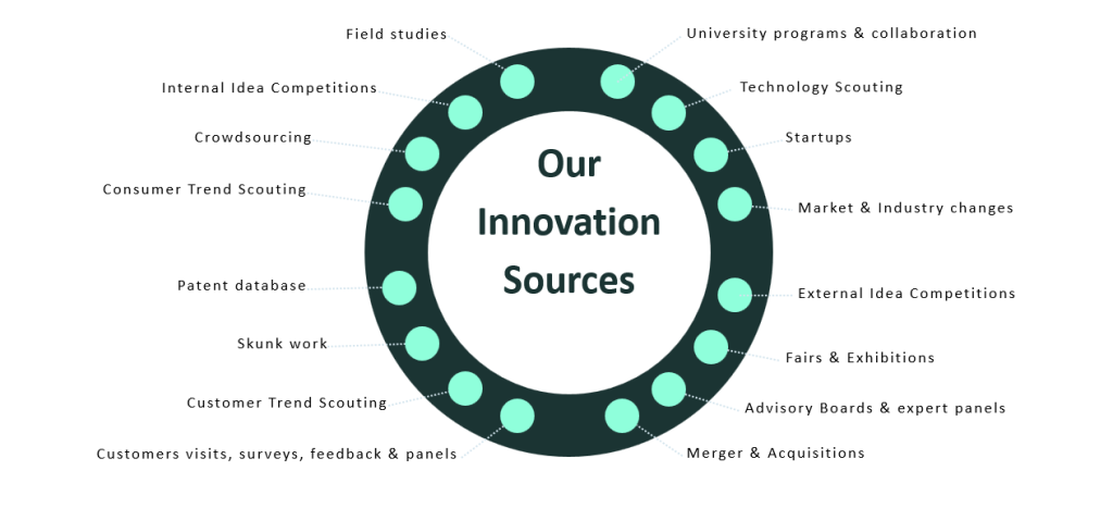 Modellen viser et udpluk af de mest anvendte innovationskilder som mange virksomheder gør brug af.